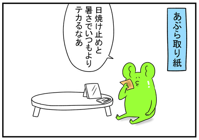 テカリは油分もあるだろうけど、暑いなら汗もあるから、タオルが一番いいと思いますよ。